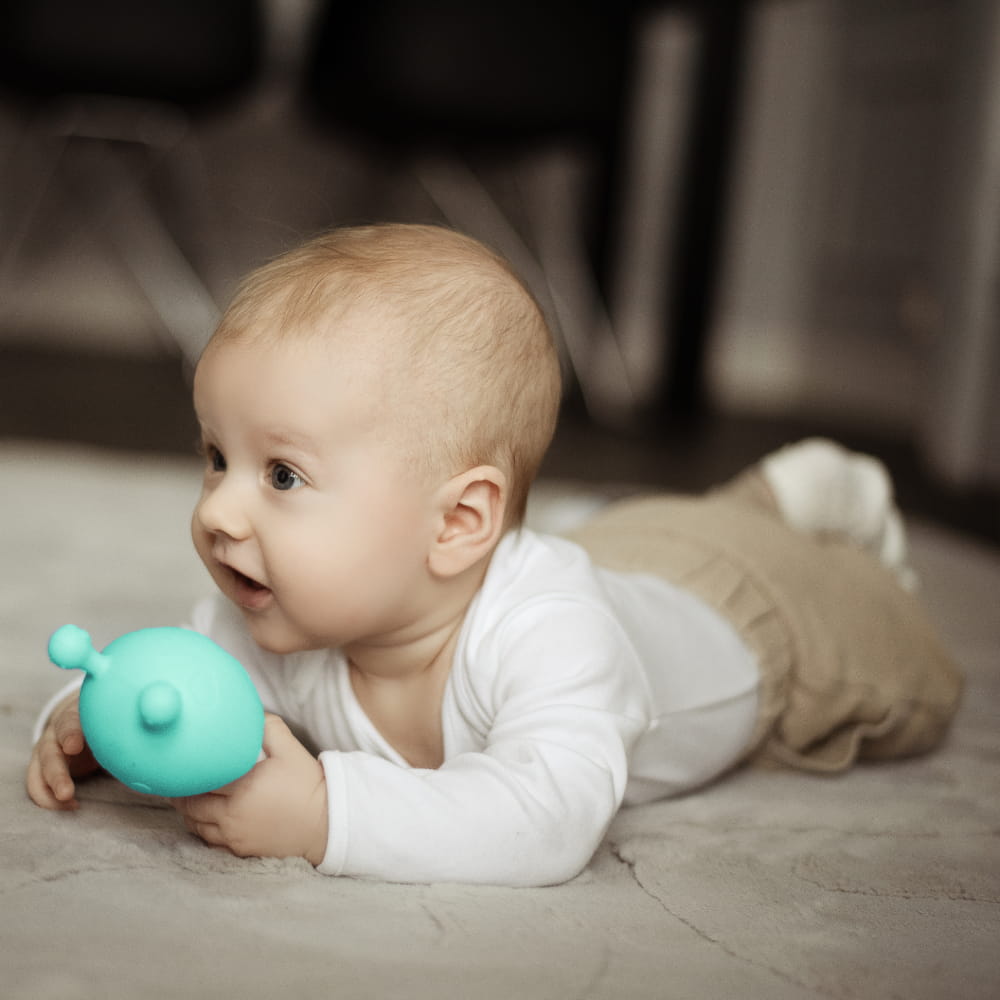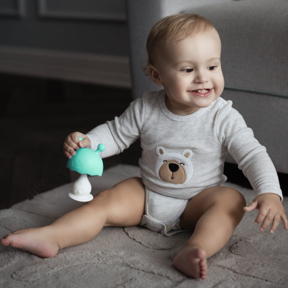 - Rozwój sensoryczny: Gryzak w kształcie grzybka ma zróżnicowaną teksturę, która wspiera rozwój dotyku i motoryki małej.