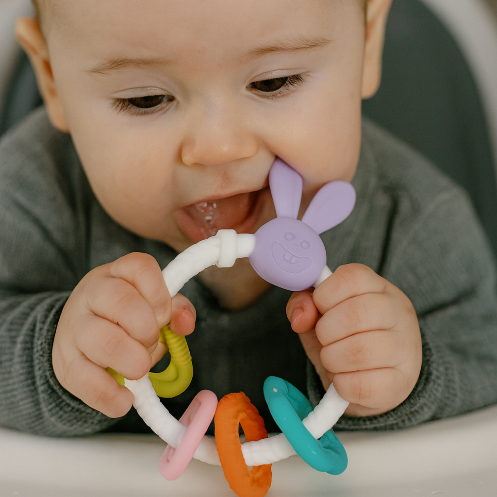 Centrum gryzaka stanowi fioletowa główka króliczka z długimi uszami, które idealnie nadają się do masowania dziąseł w tylnej części buzi. Biała, elastyczna obręcz posiada unikalną fakturę skręconego sznura, co zapewnia dodatkową stymulację sensoryczną przy każdym dotyku i gryzieniu.
