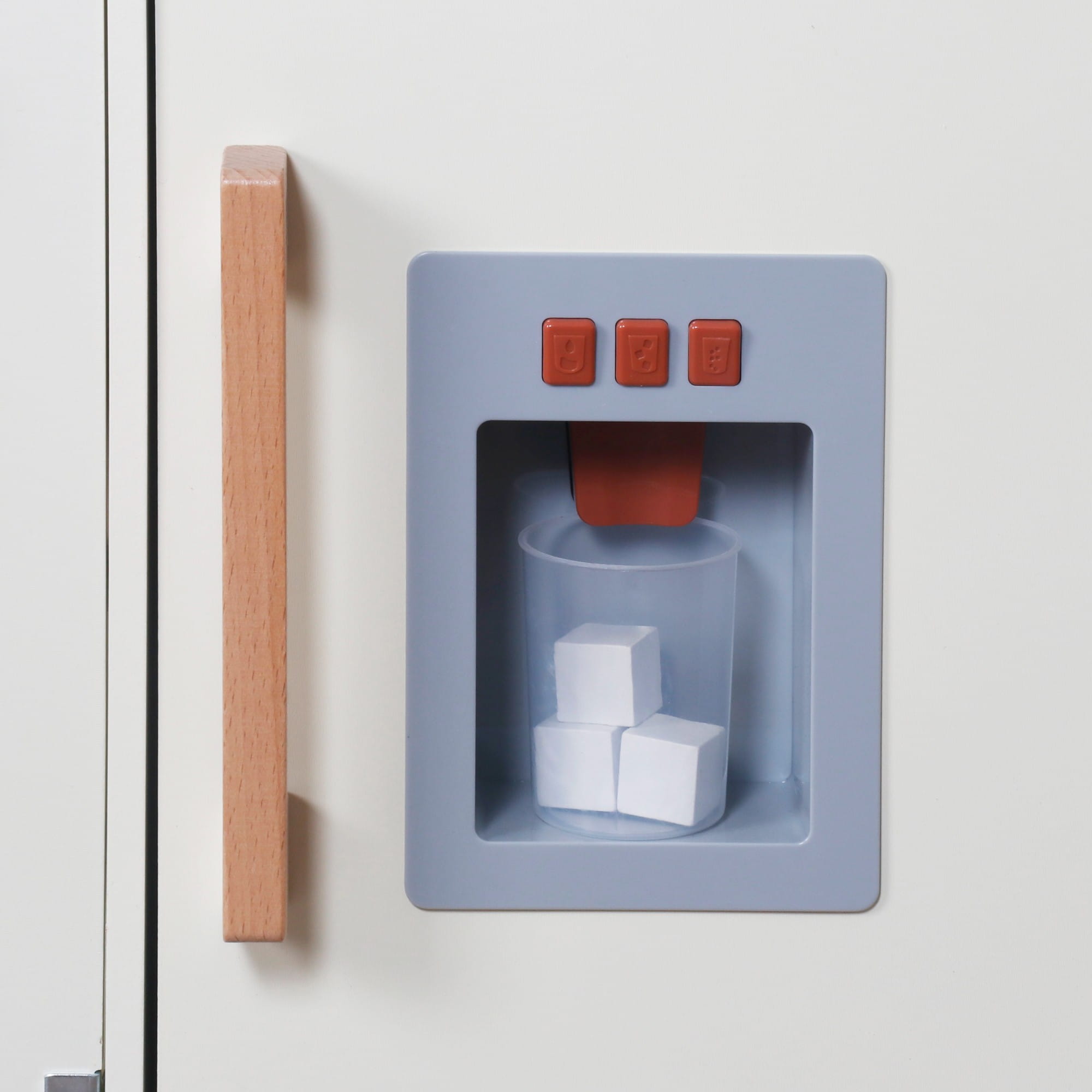 - Realistyczne wyposażenie: zlew z kranem i pokrętłami, płyta grzewcza z ruchomymi pokrętłami, kostkarka do lodu.