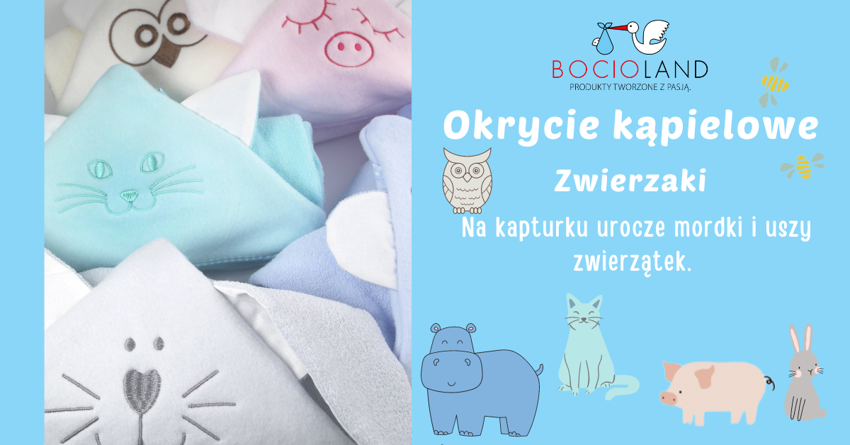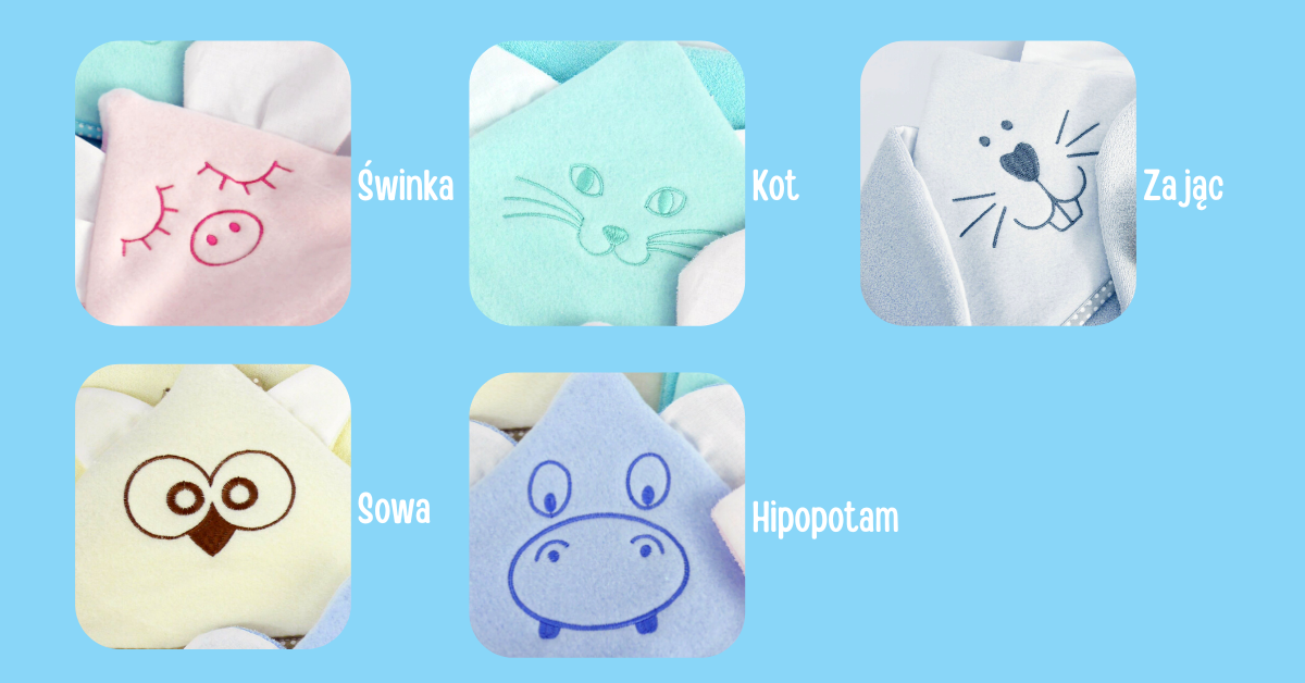 - posiada uroczy haft i uszy na kapturku (sowa, świnka, kot, hipopotam, zając)