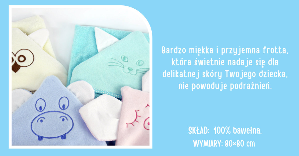 Okrycie kąpielowe daje miłe uczucie ciepła po kąpieli. Wykonane z miękkiej i przyjemnej frotty, która świetnie nadaje się dla delikatnej skóry dziecka, nie powoduje podrażnień. Na kapturku znajduje się haftowane zdobienie oraz uszy zwierzaka. Kapturek pozwala na okrycie wilgotnej główki dziecka. Jest na tyle duży, że sprawdzi się także u większego dziecka.