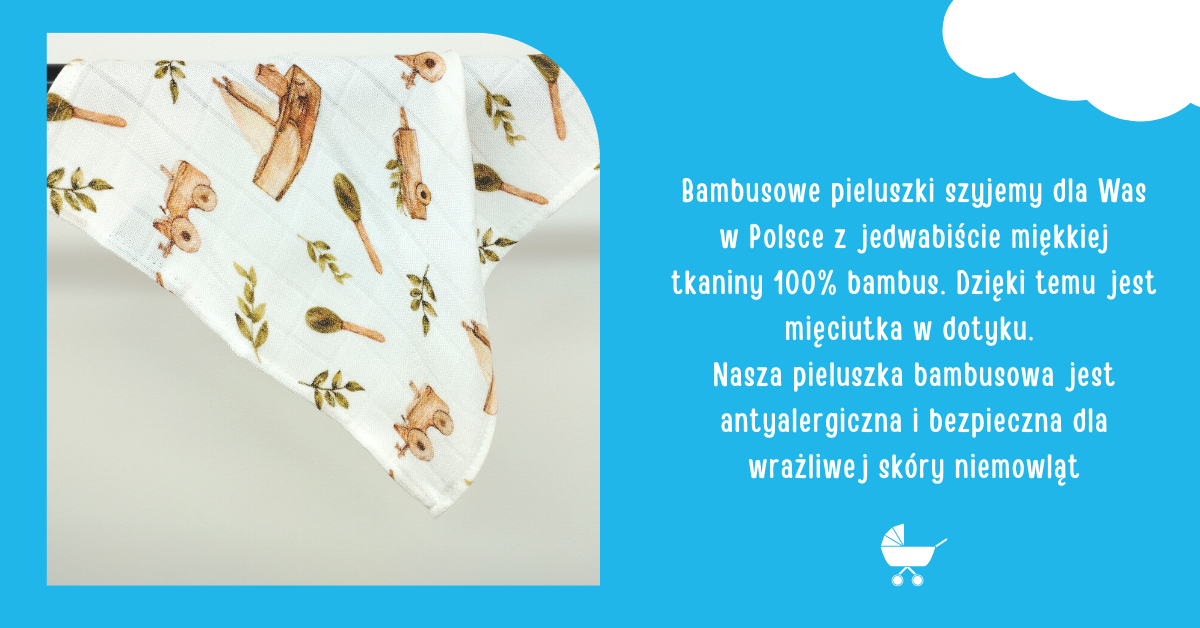 To artykuły dziecięce ze zdrowotnej tkaniny bambusowej 100%. Dzięki naturalnym właściwością antyalergicznym i antybakteryjnym tkanina nie powoduje uczuleń. Jest to ważne dla delikatnej skóry dziecka szczególnie wrażliwej na podrażnienia. Kolorystyka pieluszek jest subtelna i stonowana a tkaniny są miękkie oraz aksamitne w dotyku. Produkt wykonany jest z ogromną starannością, by spełniać najwyższe oczekiwania rodziców i ich pociech.