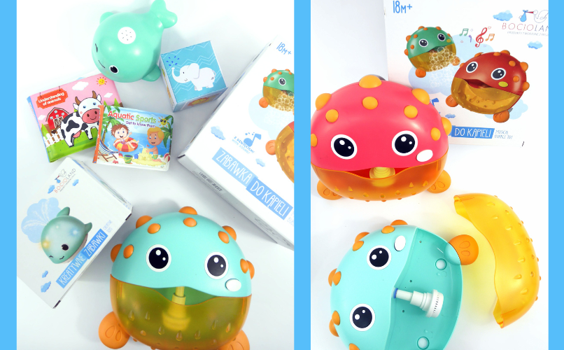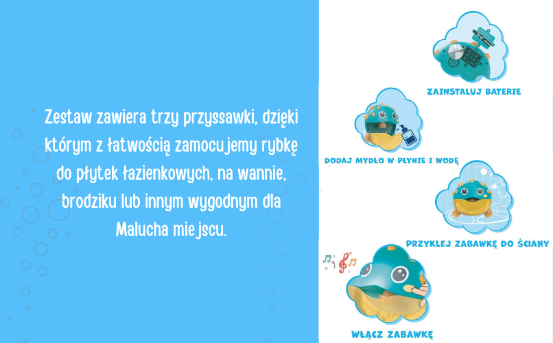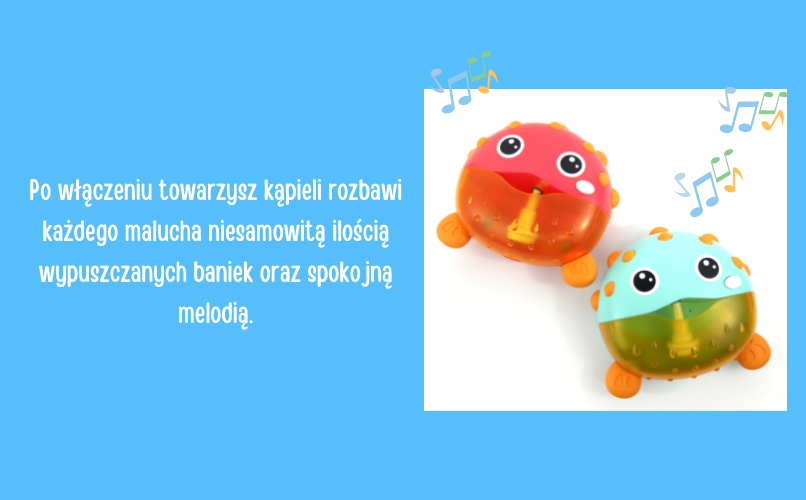 Po włączeniu towarzysz kąpieli rozbawi każdego malucha niesamowitą ilością wypuszczanych baniek oraz spokojną melodią.