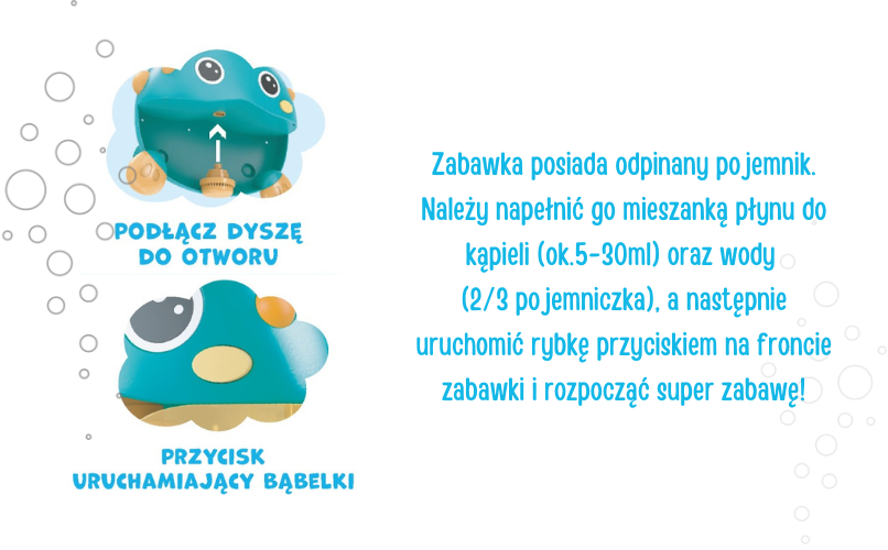 Zabawka posiada odpinany pojemnik. Należy napełnić go mieszanką płynu do kąpieli (ok.5-30ml) oraz wody