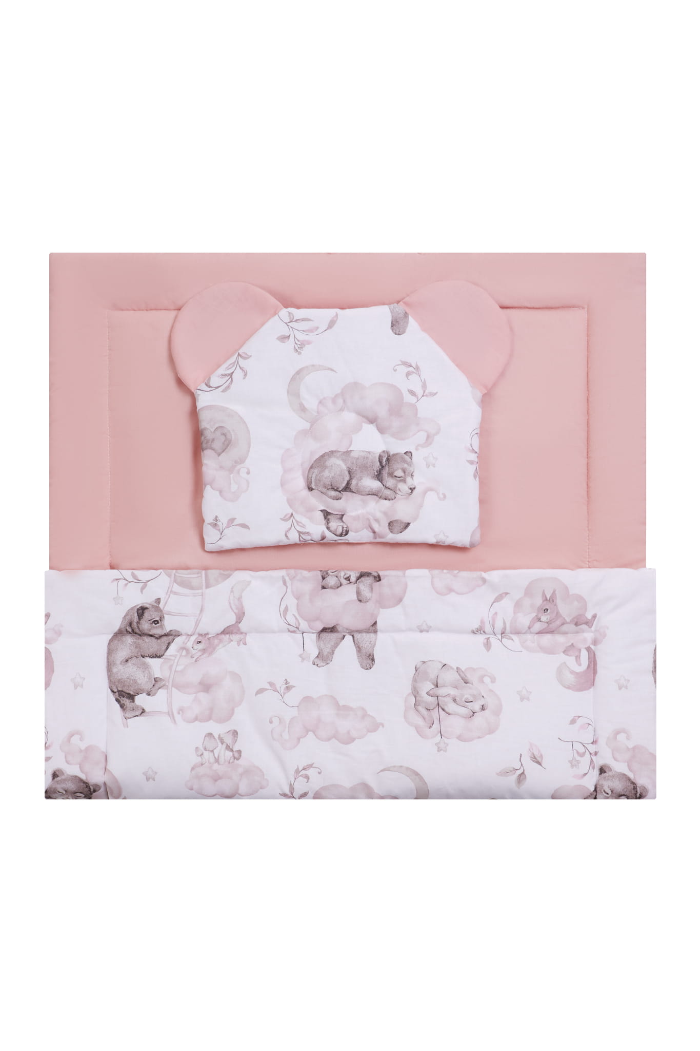 Połączenie tkaniny bawełnianej gładkiej ze wzorzystą. Kocyk ma piękne akcent w postaci "ramki", a poduszka uszy misia.