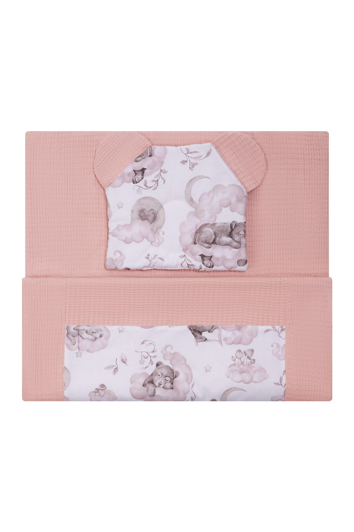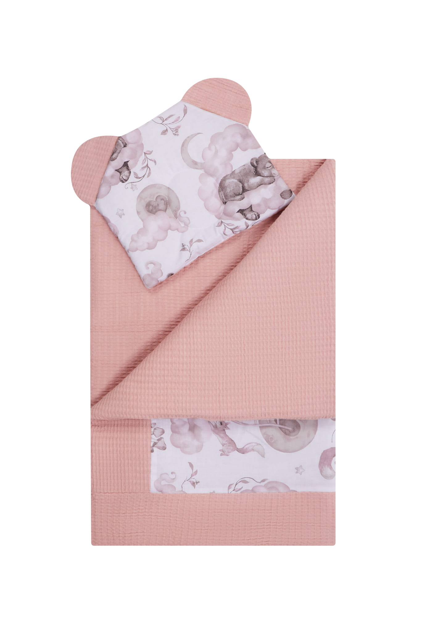 Połączenie uroczej tkaniny o strukturze wafla ze wzorzystą bawełną. Kocyk ma piękne akcent w postaci "ramki", a poduszka uszy misia.