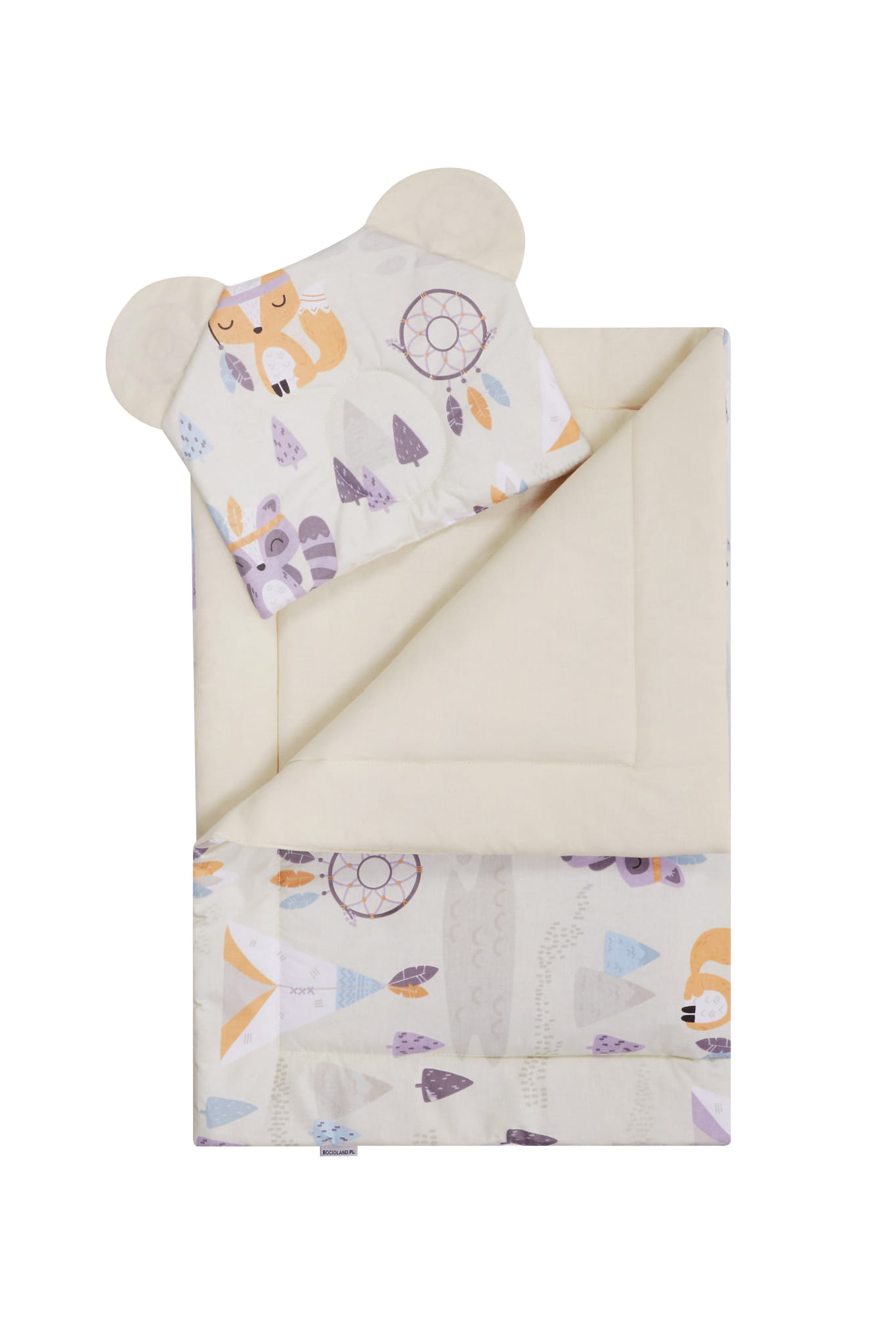 Połączenie tkaniny bawełnianej gładkiej ze wzorzystą. Kocyk ma piękne akcent w postaci "ramki", a poduszka uszy misia.