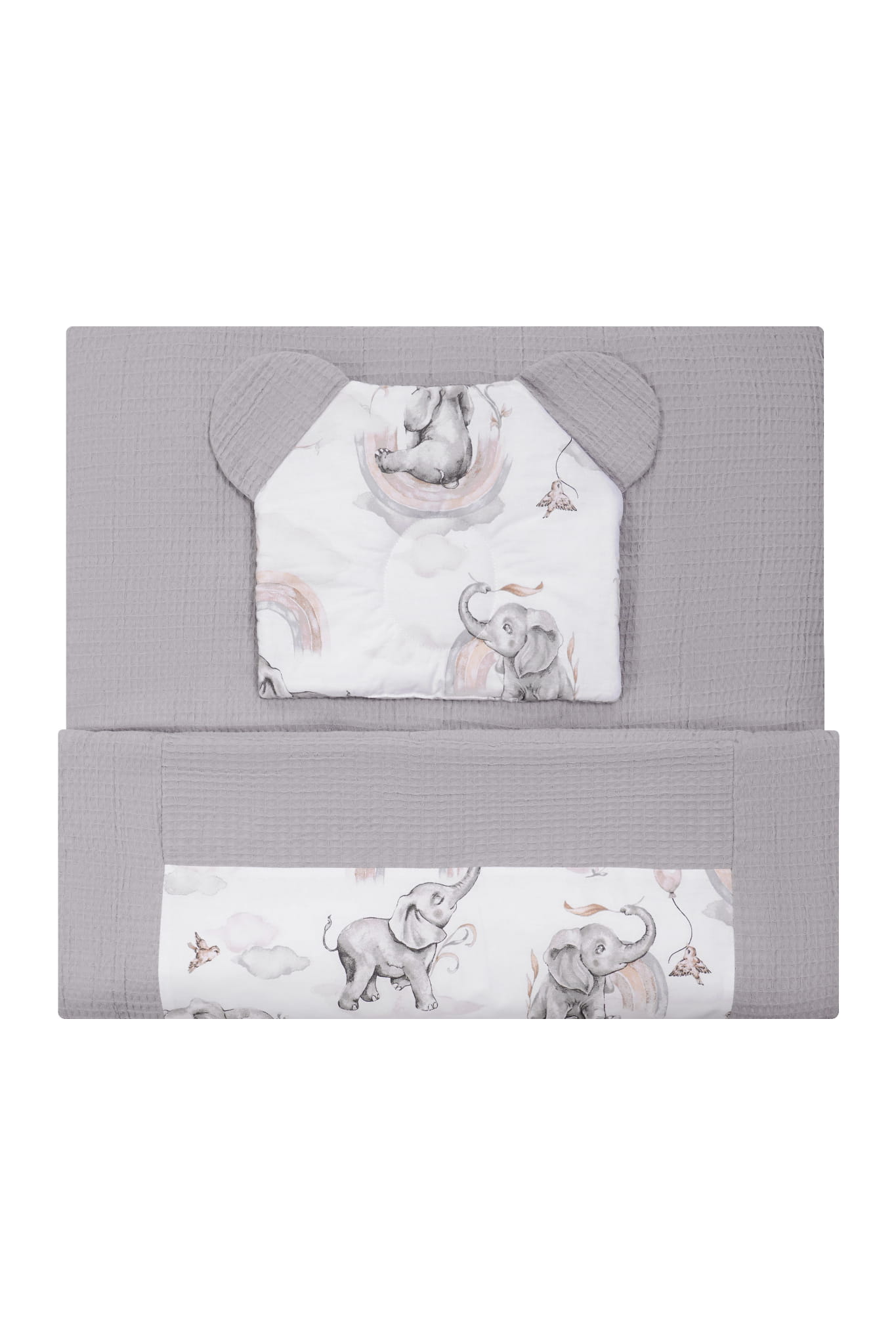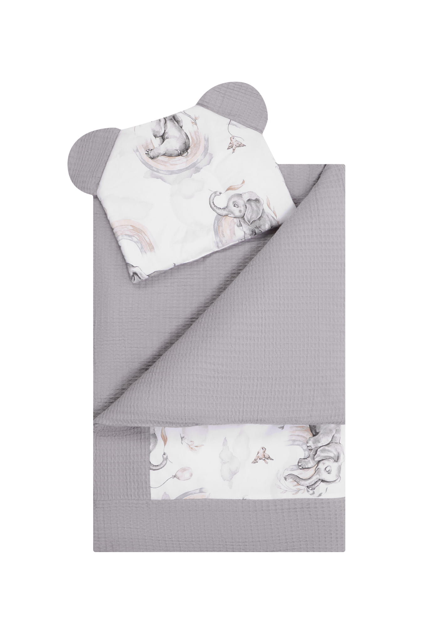 Połączenie uroczej tkaniny o strukturze wafla ze wzorzystą bawełną. Kocyk ma piękne akcent w postaci "ramki", a poduszka uszy misia.