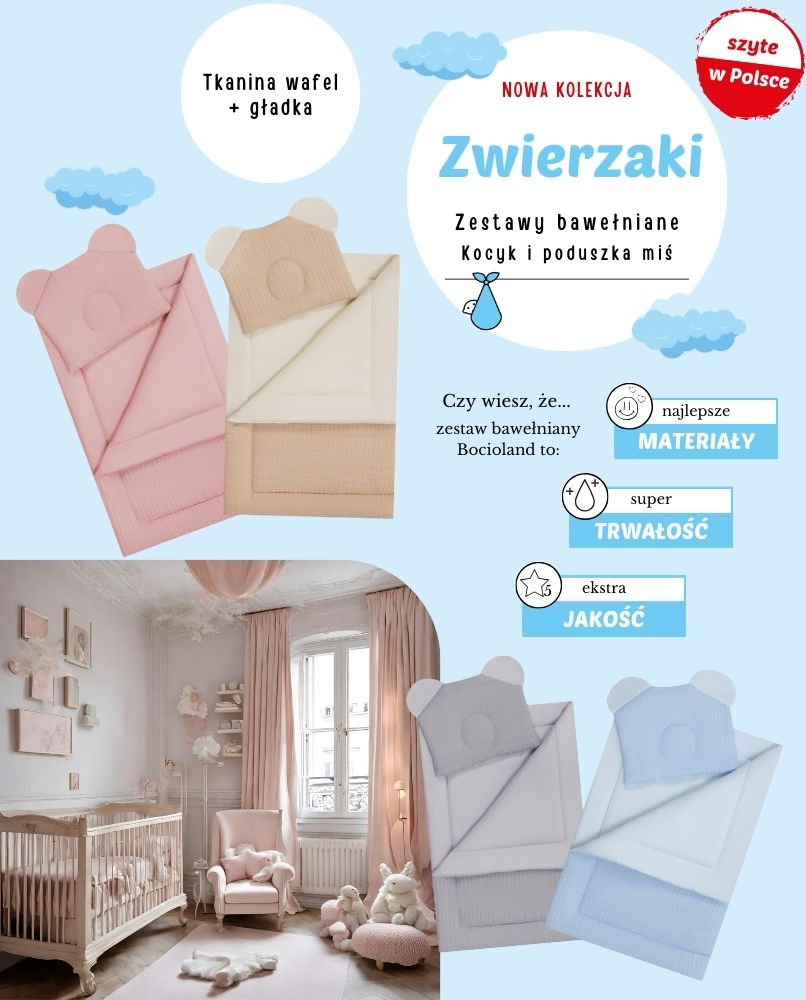 WYMIARY: kocyk 75×100 cm, poduszka 35×30 cm.