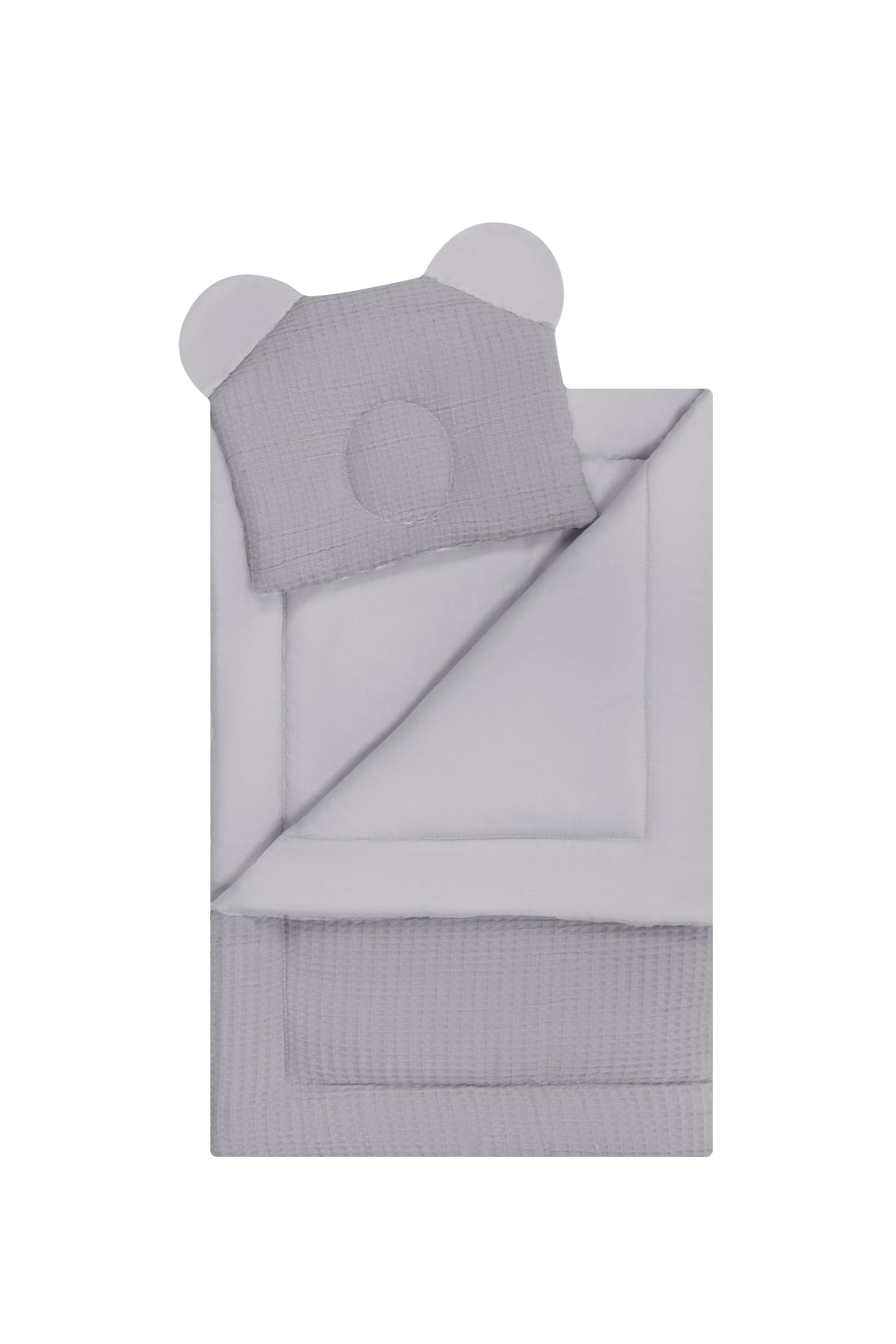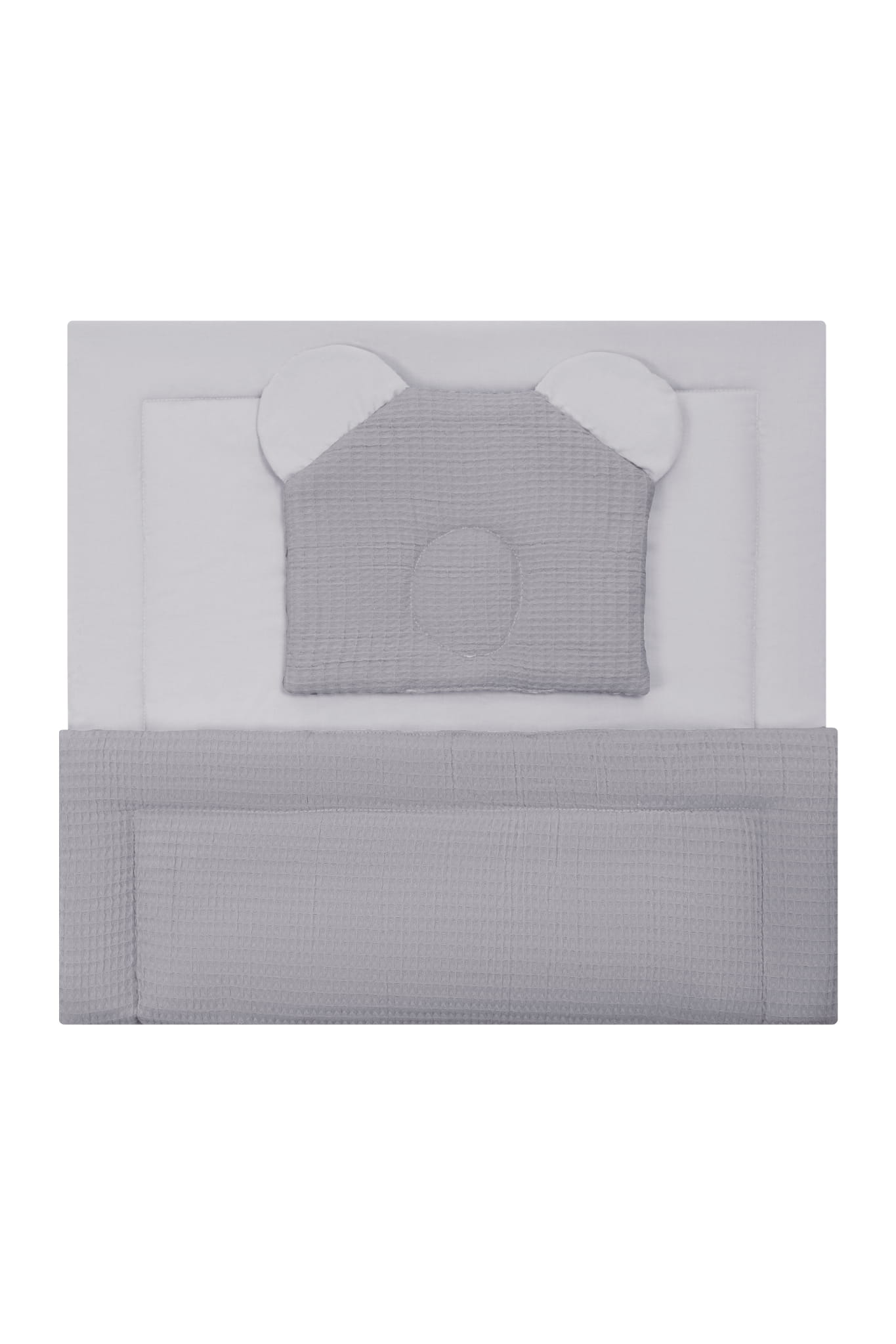 Tkanina wafel, nowoczesny design kocyka oraz poduszka miś to świetny wybór dla malucha.