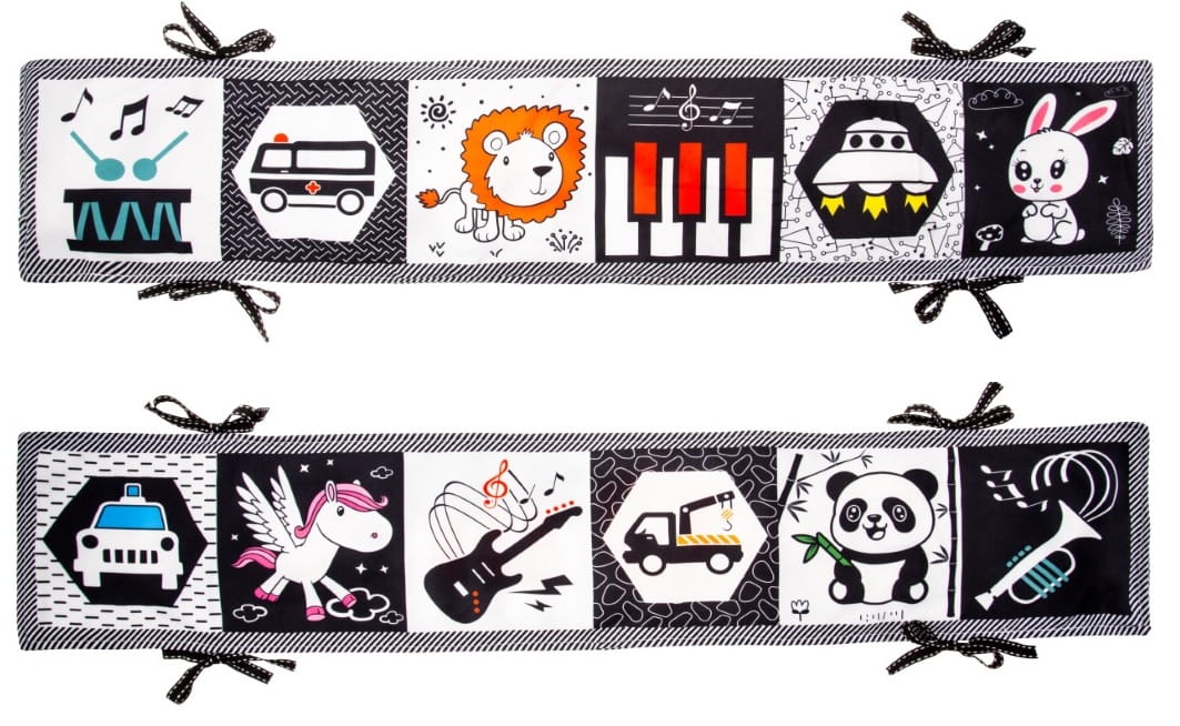 Osłonka jest miękka i szeleści przy dotyku. Ma 12 różnych kontrastowych obrazków.