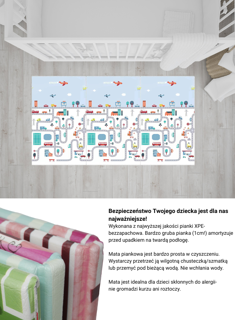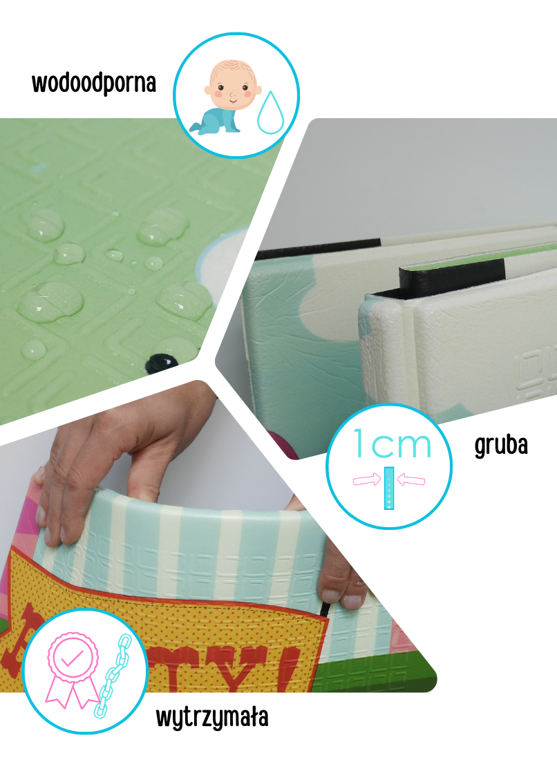 Mata jest bardzo wytrzymała i możesz mieć pewność, że Twoje dziecko będzie korzystać z niej bardzo długo. Na powierzchni posiada strukturę antypoślizgową oraz świetnie izoluje od chłodnej podłogi.
