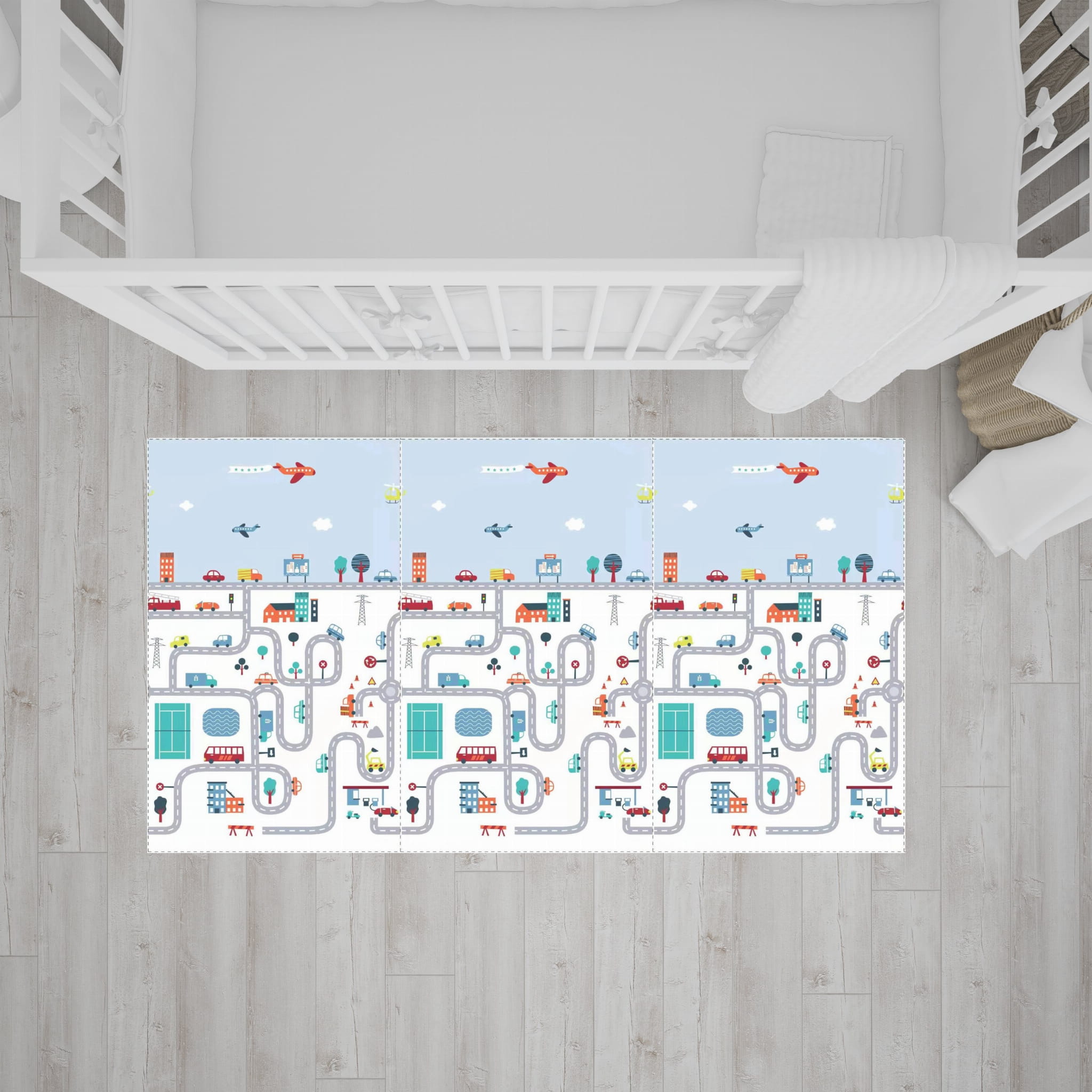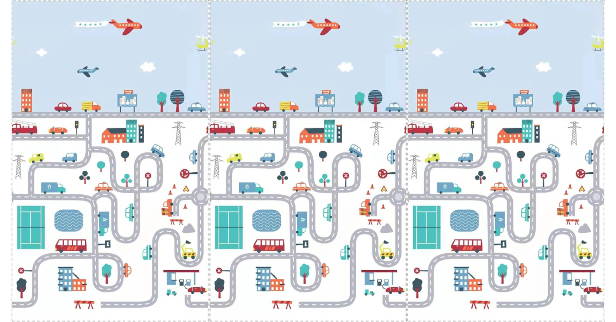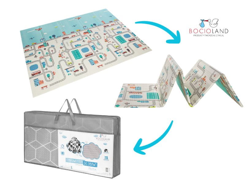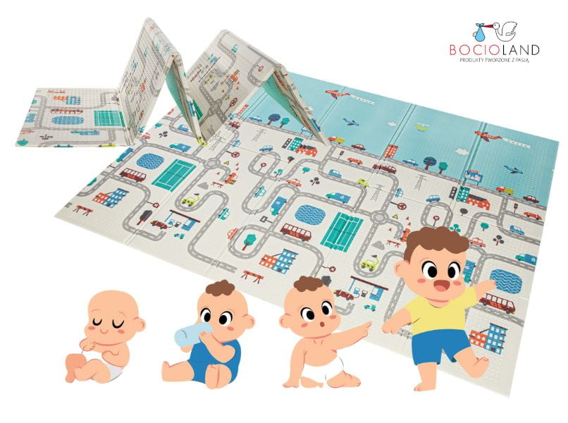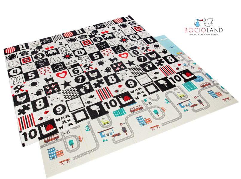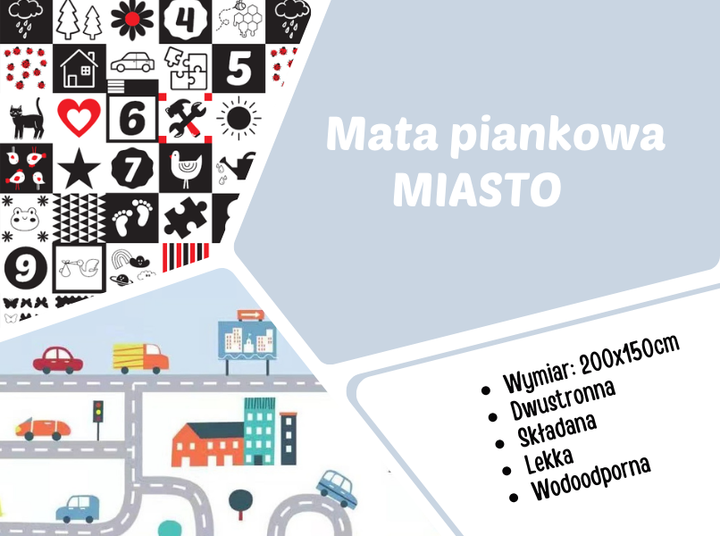 Jeżeli Twój maluch uwielbia bawić się autkami- wybierz wzór MIASTO. Są na nim ulice i domy, które ubarwią zabawę.