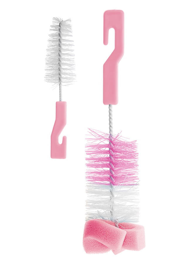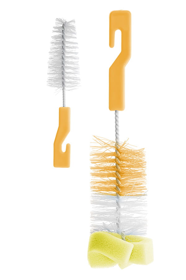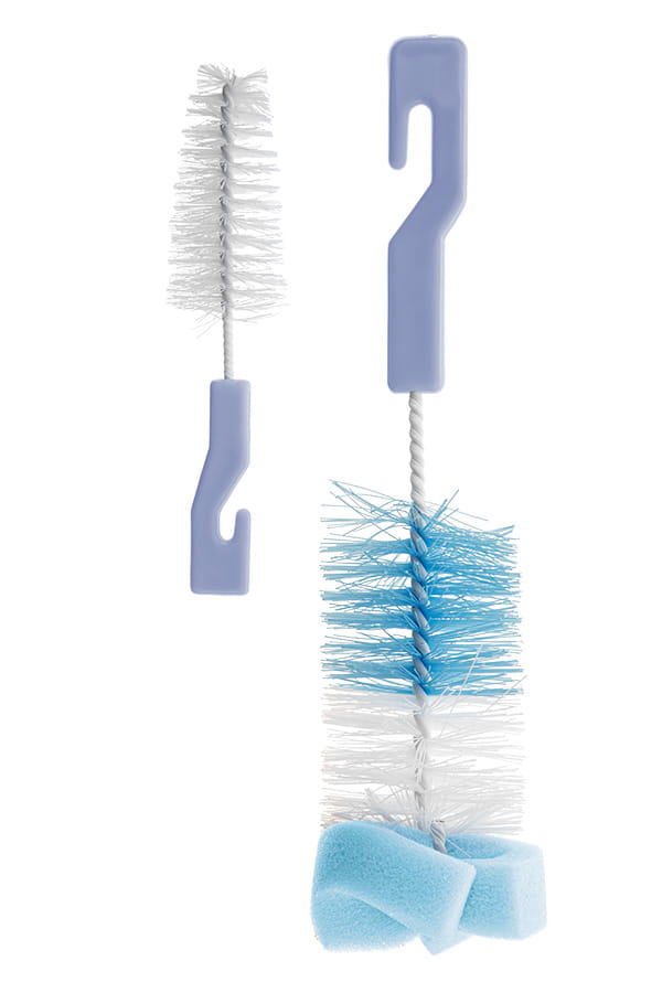 Zestaw składa się z dwóch szczotek, większej szczotki do mycia butelek oraz mniejszej, do mycia smoczków.